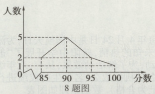 8. 如图,在“杭州第19届亚运会知多少”比赛活动中,某校10名学生的参赛成绩如图所示,对于这10名学生的参赛成绩,下列说法错误的是 ( )