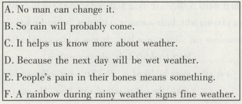49. ________ Such rainbows always come in the evenings and the following days will become clear. If the stars twinkle(闪烁)clearly at night, then fine weather will continue. If a frog(青蛙)appears in the morning, just about sunrise, then the day will be warm. Instead, if a frog appears in the evening, we should be careful. 50. ________