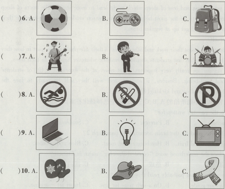 第二节 听下面五段短对话,从每小题所给的A、B、C三幅图片中选择与听到的信息相关联的一项。每段对话读两遍。