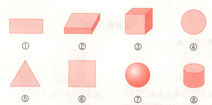 ( )是正方体,( )是长方体,( )是正方形,( )是长方形,( )是三角形,( )是圆柱,( )是圆,( )是球。