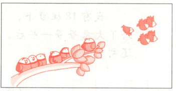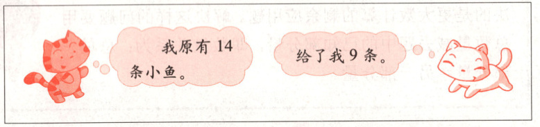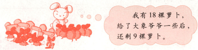 ①还剩几棵萝卜 17 - 8 = 9 ②树上原有13只小鸟 13 - 4 = 9 ③还剩几条小鱼 14 - 9 = 5 ④给了大象爷爷几棵萝卜 18 - 9 = 9(本题答案不唯一)