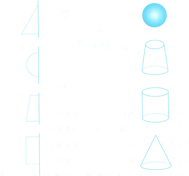 ①左边各平面图形绕轴旋转一周,分别得到右边的哪个立体图形?连一连。