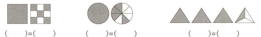 $4=\frac{(\ \ )}{4}$ $6=\frac{12}{(\ \ )}$ $5\frac{1}{4}=\frac{(\ \ )}{4}$