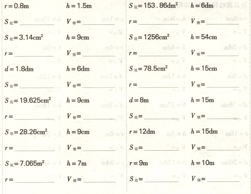 2. 一堆煤呈圆锥形,底面半径1.5m,高1.8m,每立方米煤约重1.4t。这吨煤约重( )t。(得数保留整数)