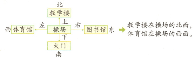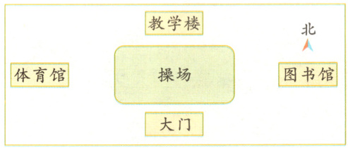 解:教学楼在操场的( 北 )面,体育馆在操场的( 西 )面。操场在图书馆的( 西 )面,图书馆在体育馆的( 东 )面。教学楼在大门的( 北 )面,大门在教学楼的( 南 )面。