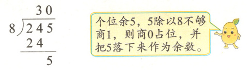 分析:每根长跳绳8元,245元买长跳绳,要求可以买多少根,还剩多少钱,就是求245里面有几个8,还剩几,用除法计算,列式为245÷8。可以用竖式计算,过程如下。