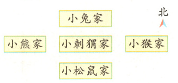 分析:以小刺猬家为观察点,可知小松鼠家应画在小刺猬家的南面(即下面),小熊家应画在小刺猬家的西面(即左面)。小刺猬家在小猴家的西面,说明小猴家在小刺猬家的东面(即右面);小刺猬家在小兔家的南面,说明小兔家在小刺猬家的北面(即上面)。