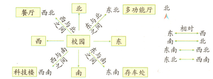 同理,以存车处为观察点,餐厅在正北和正西方向之间,即在存车处的西北方向;以多功能厅为观察点,科技楼在正西和正南方向之间,即在多功能厅的西南方向,反过来以科技楼为观察点,多功能厅就在科技楼的东北方向。