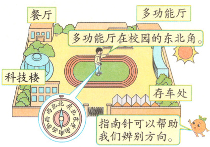 分析:图中小男孩手里拿着指南针站在操场中间辨别校园里各种建筑物的方向。从指南针上我们可以看到,除了东、南、西、北四个方向外,还有东北、东南、西北、西南四个方向。以校园为观察点,对应的四个建筑物所在的方向如下:
