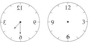 下面的左图是镜子中看到的时间,请在右图中画出现实的时间。