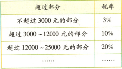 例1 2019年我国公布了新的个人收入所得税征收标准。个人月收入5000元以下不征税,月收入超过5000元,超过部分按下面的标准征税。