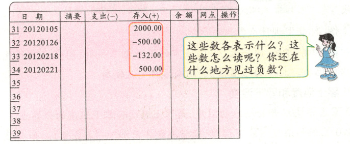 为了表示两种相反意义的量,如零上温度与零下温度,收入与支出等,需要用到正数和负数。一种是我们以前学过的数,如3、500、4.7、$\frac{3}{8}$,这些数是正数;另一种是在这些数的前面添上负号“-”的数,如-3、-500、-4.7、-$\frac{3}{8}$,这些数是负数。