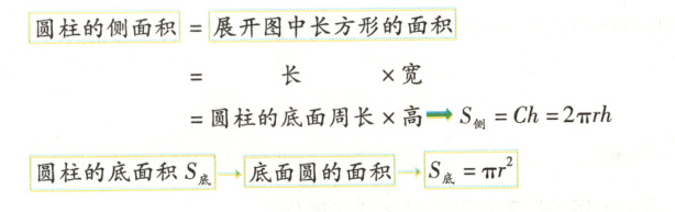 观察上图,容易发现:圆柱的表面积 = 圆柱的侧面积 + 两个底面的面积。