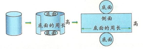 观察上图可知,圆柱的侧面展开图是长方形,底面是圆。