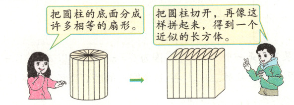 分析与解:类比圆的面积计算公式的推导过程,我们也可以把圆柱的底面分成许多相等的扇形,如分成16等份,然后按照等分线并沿着圆柱的高把圆柱切开,再像下面这样拼起来,就会得到一个近似的长方体。