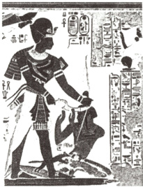 4. 拉美西斯二世(见右图)头戴蓝色王冠,身着华服,左手持弓并抓着敌人的头发,右手持刀正在砍敌人的头部,其脚边有一只体型较小的野兽扑咬敌人。这一画面