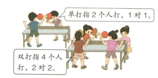 解析:单打表示有2人打,双打表示有4人打。总人数÷每组的人数=组数,若有余数,则表示还余多少人。