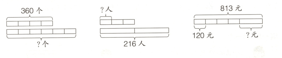813 - 120×4 = 333(元) 解析:先用乘法算出这4份共多少元,再用总价减这4份的钱数,就是剩下的钱数。