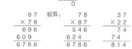解析:笔算除法时,注意每次除完后余下的数都要比除数小。笔算乘法时,注意相同数位对齐。用乘法与除法的互逆关系进行验算;验算乘法时,也可以用交换两个乘数的位置的方法进行验算。