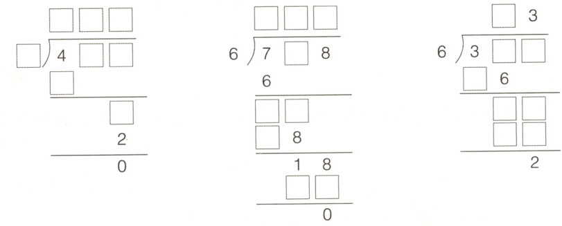 解析:第一个竖式从余数看起,余数为0,上面是2,那么被除数个位上的数字应该是2,2÷□没有余数,所以□ =1或2,也就是除数是1或2;竖式中十位上的数没有参与运算,所以十位上的数应该是0;所以被除数是402。除数是2 时,商是201;除数是1时,商是402。第二个竖式从百位除起,7÷6 = 1……1,那么百位上余下的1与十位上的几组成十几,除以6的余数是1,1 + 8 = 9,所以被除数十位上的数字应该是9,故被除数是798,商是133。第三个竖式,商十位上的数乘除数6所得的积的个位上是6,可知商的十位上是6,那么商十位上的数与除数的积是36;商的个位上是3,6×3 = 18,最后余数是2,18 + 2 = 20,36 + 2 = 38,所以被除数是380。