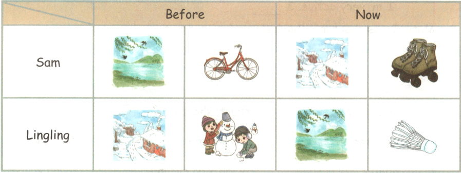 Sam liked spring before, because he could 1. ____________ outside. Now, he likes winter. He loves to 2. ____________. Lingling liked 3. ____________ before. She could make a snowman with her friends. Now, she likes 4. ____________ best, because she can 5. ____________ in the park.