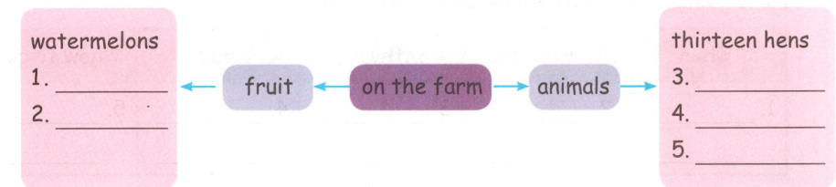 1.grapes 2.pears 3.fifteen ducks 4.three pigs 5.a horse