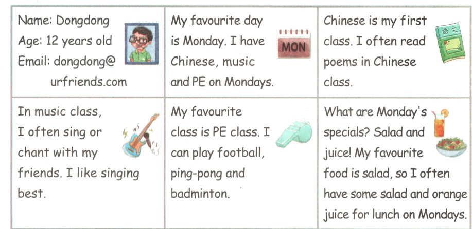1. I have maths, Chinese and English on Mondays.2. My favourite subjec is English.3. I often play basketball.