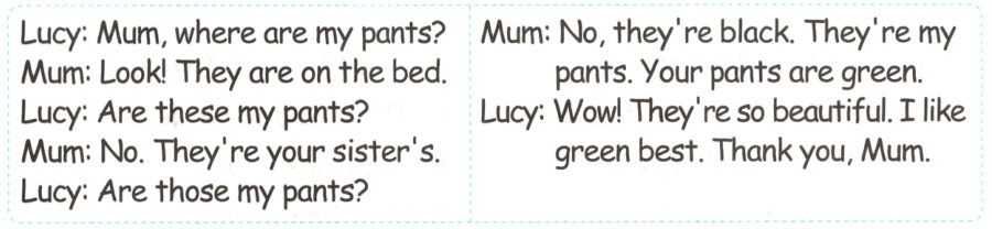 Mum buys three pairs of (三条) pants. She puts them on the bed.