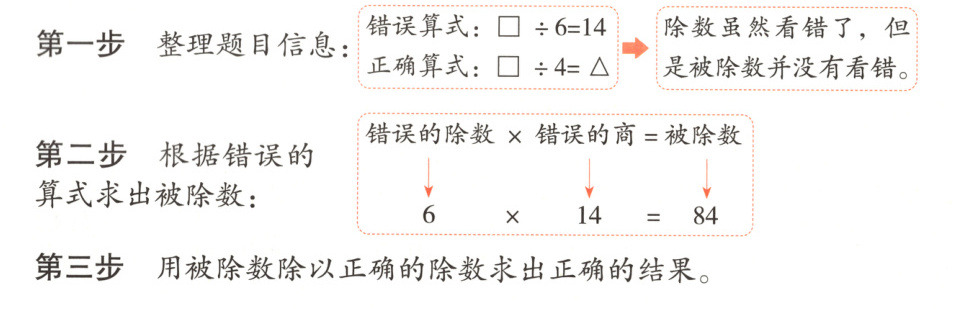 例3. 一道除法算式题,除数是4,计算时,李明把除数看成了6,结果得14,正确的结果应是多少?