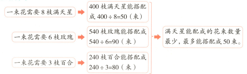 例2. 花店运来400枝满天星、540枝玫瑰和240枝百合。如果用8枝满天星、6枝玫瑰和3枝百合搭配成一束花,那么这些花最多能搭配成多少束?