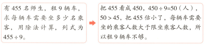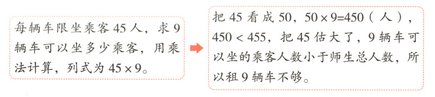 例2 阳光小学三年级老师和学生共455人去郊游,每辆车限坐乘客45人,租9辆车够吗?