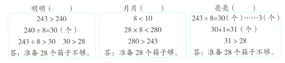 3. 李老师准备了243个石榴,如果每箱装8个,准备28个箱子够吗?下面是三位同学的解答。