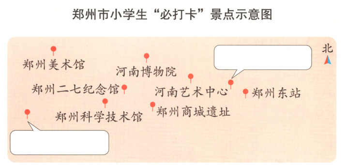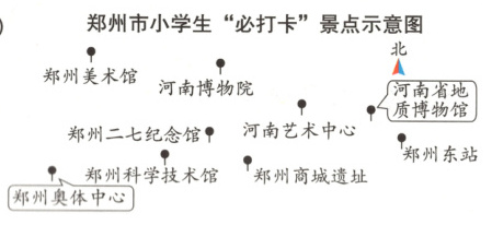 (3)图上的两处空白位置分别是河南省地质博物馆和郑州奥体中心,河南省地质博物馆在郑州奥体中心的东北方向,请把它们填到对应的位置上。