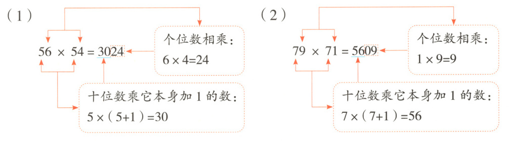 思路引导 观察这两个算式,都是两位数乘两位数,每个算式的两个两位数十位上的数都相同,个位上的数的和是10,这样的算式叫“头同尾合十”的乘法算式。