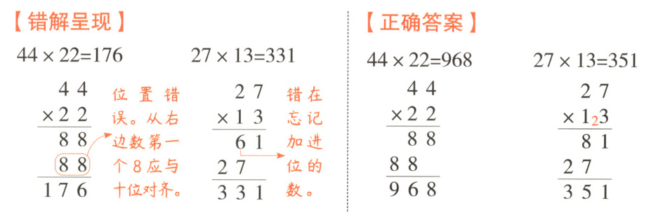 纠正策略 笔算两位数乘两位数时,用十位上的数去乘时,所得的积的末位要和十位上的数对齐。哪一位乘得的积满几十,就向前一位进几。