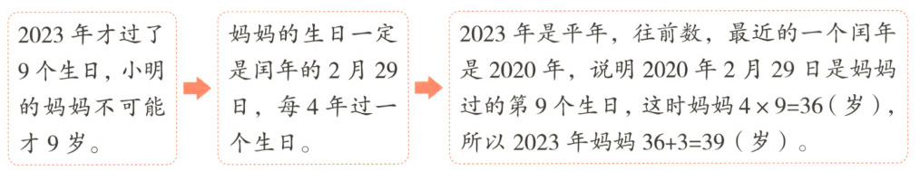 例1 小明的妈妈到2023年才过了9个生日,2023年妈妈多少岁?