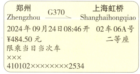 2 李叔叔从郑州到上海,下图是所乘车的车票信息。