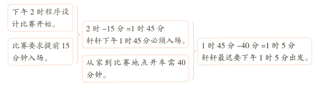 例1 5月9日下午2时程序设计比赛将在第一附属小学举行,爸爸决定开车送轩轩去参加比赛,从家到比赛地点开车需40分钟。比赛要求提前15分钟入场。轩轩要想准时参加比赛,最迟要什么时间出发?