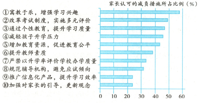 2. 最受家长认可的两项减负措施是______(填序号),请你再提出几条减负措施:______________________________(2分)