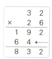 2. [新趋势·算理探究]小青蛙每次跳32格,它跳了26次,一共跳了多少格?列竖式如图,箭头所指那一步表示( )。