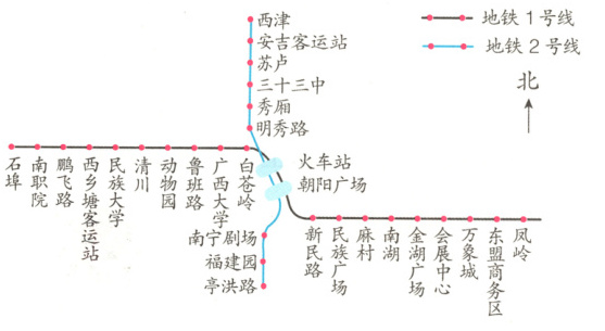 (2)小光从“三十三中”站坐地铁( )号线,向南坐2站到( )站,再向( )坐( )站到“朝阳广场”站。