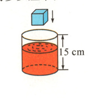4. 如图,一个圆柱形玻璃杯中盛有水,水面高10 cm,玻璃杯内部的底面积是60 cm²,在这个杯中放入棱长是6 cm的正方体铁块后(铁块被浸没),这时水面离杯口有多少厘米?
