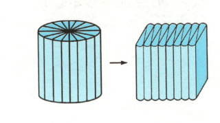 3. 把一个高是 8 cm 的圆柱按下图切开,拼成近似的长方体,表面积增加了 40 $cm^{2}$,圆柱的表面积和体积分别是多少?