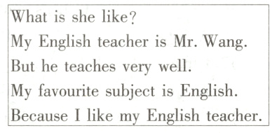 B: She is kind to us. She always tries to make English easy to understand. We find English interesting. Who is your English teacher?