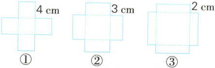5. 一个边长为12 cm的正方形纸板的4个角各剪去一个大小相同的小正方形后,折叠可以得到一个无盖纸盒,下面3种方案剪出的纸盒,( )的体积最大。(填序号)