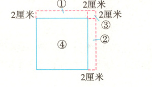 增加的部 图①:宽是2厘米,长等于原正方形的边长的长方形 图①和图②的