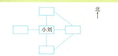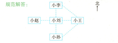 分析:图中小刘的位置已经给出,可以先确定与小刘有直接关系的人的位置。小孙在小刘的南面,可以知道小孙在此图中应该是在小刘下面的位置;同理可以确定小赵的位置,再根据小孙的位置来确定小王的位置,最后根据小王的位置来确定小李的位置。