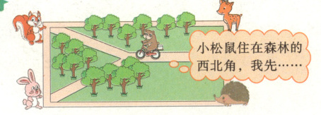 分析:(1)图中没有给出方向标,要判断小动物的位置可以先从小熊说的话着手。图中描绘的是一片森林,小松鼠在森林的西北角,说明上面是北,左面是西,右面是东,下面是南,则小鹿住在东北角,小刺猬住在东南角,小兔住在西南角。