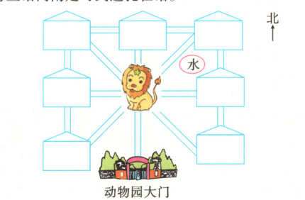 星期天,我们去动物园游玩,走进动物园大门,正北面有狮子馆和熊猫馆;鹿馆在狮子馆的西北面;天鹅馆在狮子馆的东北面;经过鹿馆向南走,可到达虎山和羚羊馆;经过虎山向东走可到达狮子馆和鳄鱼馆;经过鳄鱼馆向南走可到达孔雀馆。