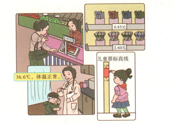 买水果时称水果的质量,电子秤上显示3.45千克;文具店里物品的标价是0.85元、2.60元;测量体温时,体温是36.6℃;儿童票标高线在1.2米到1.5米之间。